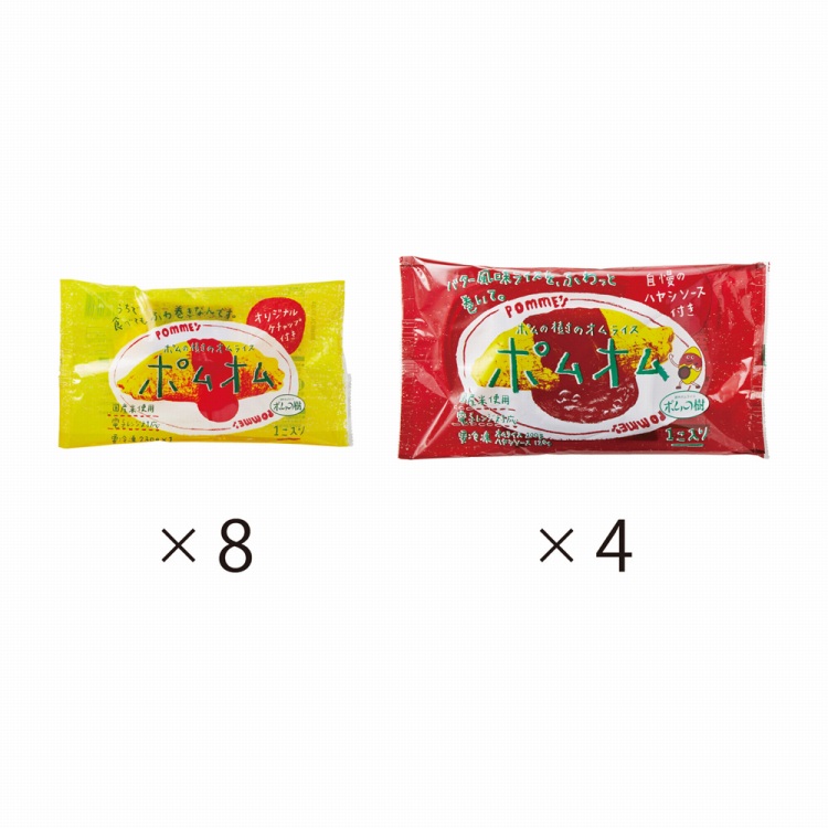 商品内容●セット内容:ポムオム230g(オムライス200g、ケチャップ付)×8、ポムオムハヤシ320g(オムライス200g、ハヤシソース付)×4