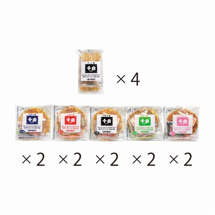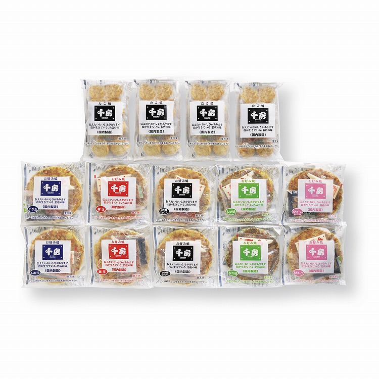 千房特製お好み焼ミックス粉を使用しふっくらと焼き上げた「いか豚ミックス」、牛すじこんにゃく入りのあっさり醤油味の「ねぎ焼」等を詰め合わせました。