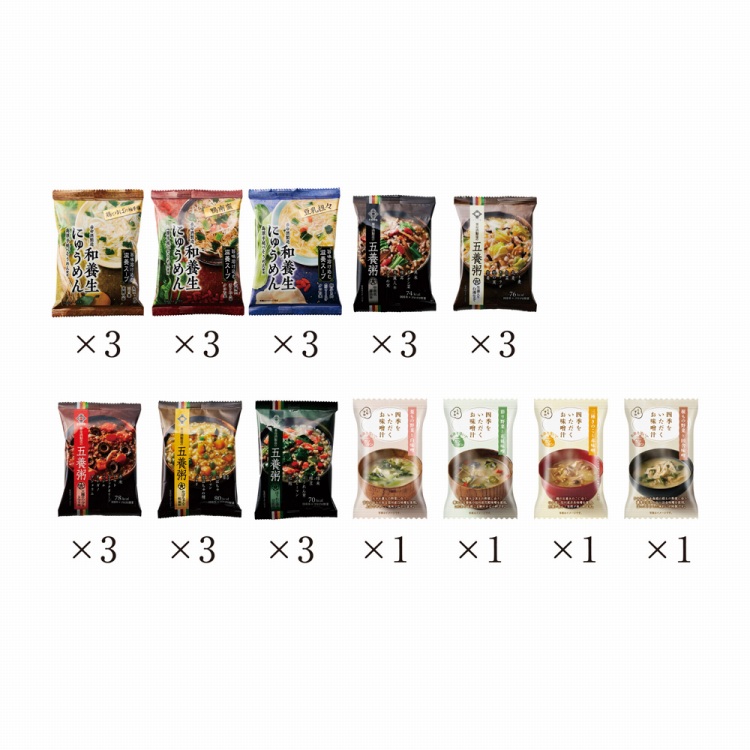 商品内容●セット内容:和養生にゅうめん(鶏とゆばの柚子塩・鴨南蛮・豆乳担々各3)、五養粥(黒・白・赤・黄・緑各3)、四季をいただくお味噌汁(葉もの野菜と白味噌・彩り野菜と花糀味噌・三種きのこと赤味噌・根もの野菜と田舎味噌各1)