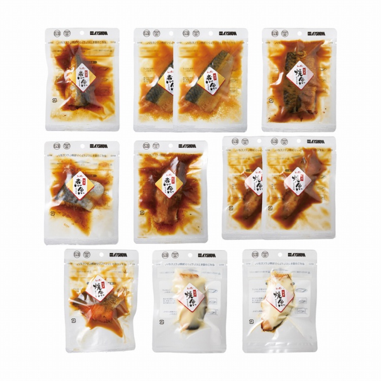 商品内容●セット内容:さば味噌煮70g・金目鯛味噌漬焼60g各2、さば味噌漬焼90g・さわら煮付け70g・金目鯛煮付け70g・紅鮭味噌漬焼60g・いわし煮付け50g・鮭チーズ焼50g・鮭マヨネーズ焼50g各1