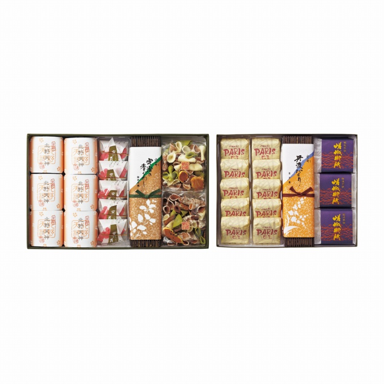 商品内容●セット内容:嵯峨御所×15、巴里×10、北野天神×6、古都瓦×5、吹き寄せ65g×2、丹波だより・宇治の香ぐわし各1