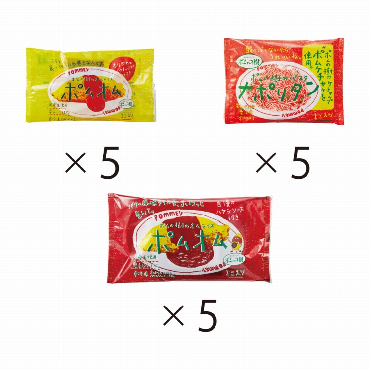 商品内容●セット内容:ポムオム230g(オムライス200g、ケチャップ付)・ポムオムハヤシ320g(オムライス200g、ハヤシソース付)・ナポリタン250g各5
