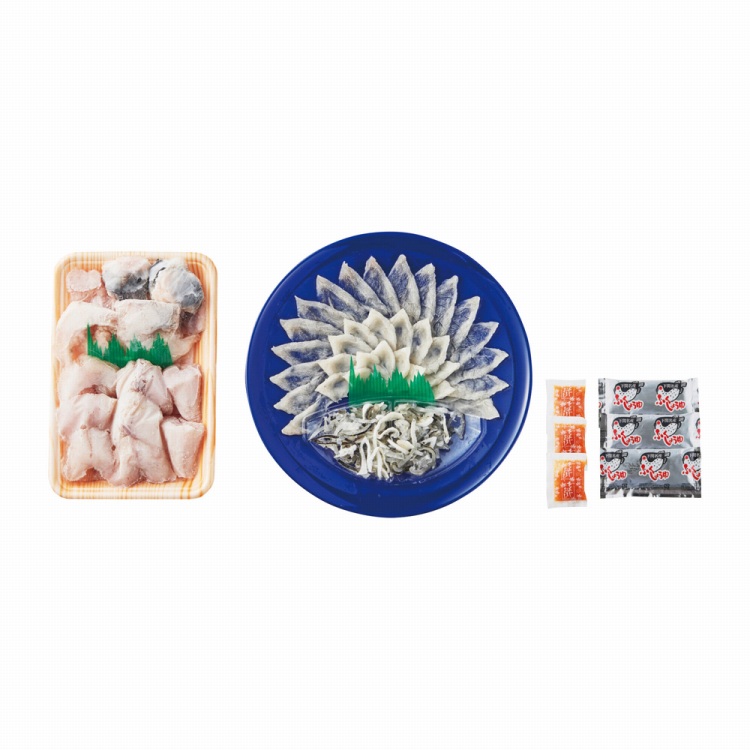商品内容●セット内容:ふぐちり(とらふぐアラ200g・しろさばふぐ切身160g〈合計360g〉)・とらふぐ刺身45g・とらふぐ皮30g各1、ふく醤油・もみじおろし付