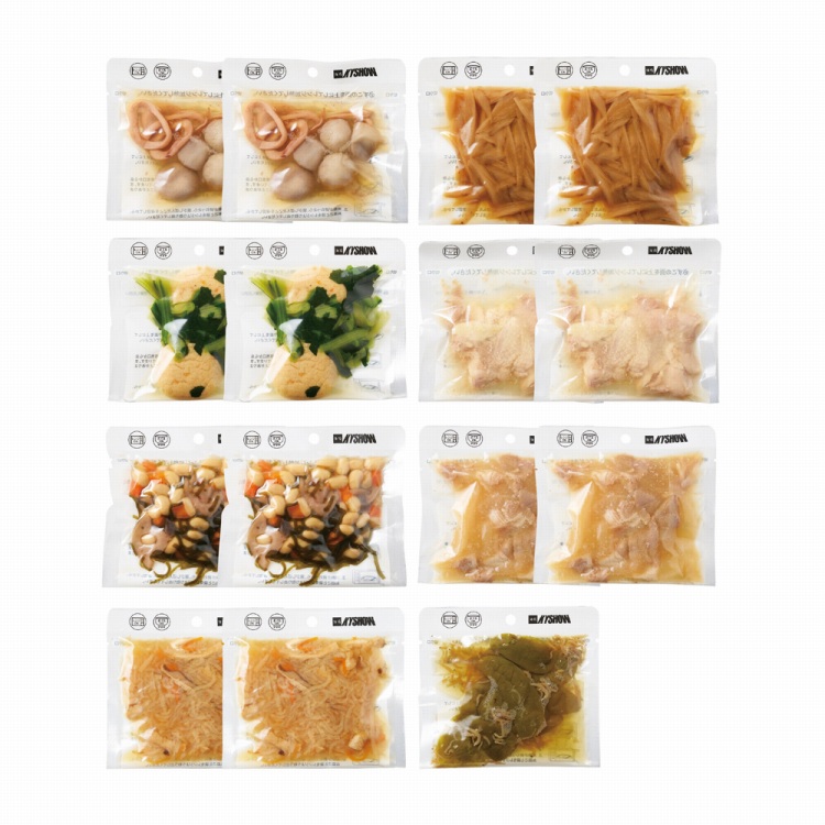 商品内容●セット内容:切干大根100g・ごぼう金平100g・いか小芋100g・鶏みぞれ煮100g・豚肉と大根の味噌煮100g・ひろうすと小松菜の煮物100g・大豆五目煮100g各2、じゃこ甘唐辛子100g×1