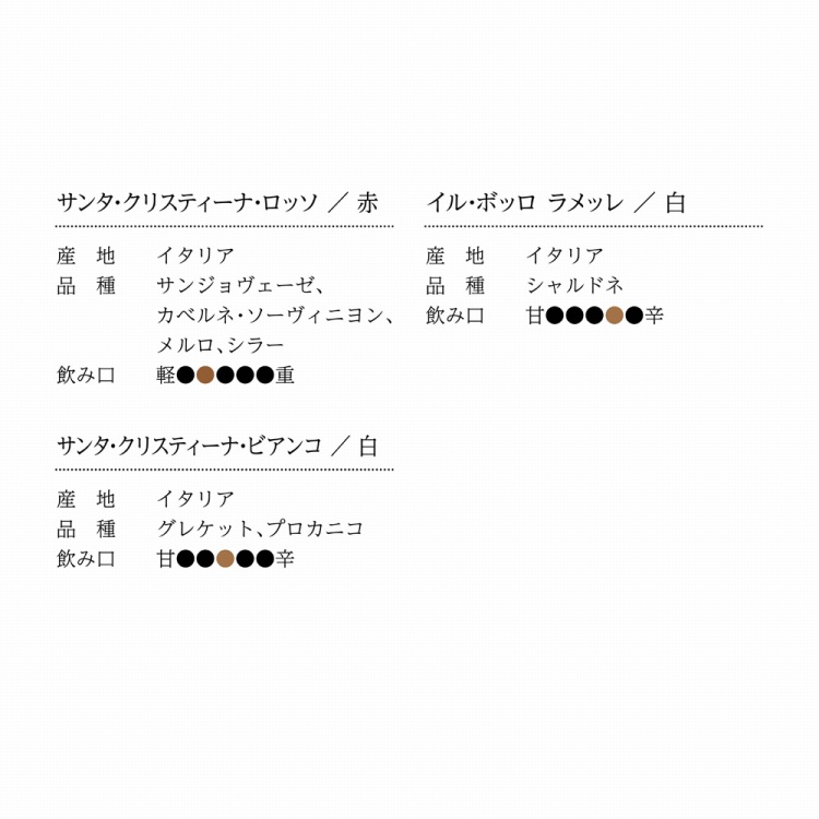 商品内容●サンタ・クリスティーナ・ロッソ750ml、サンタ・クリスティーナ・ビアンコ750ml、イル・ボッロ ラメッレ750ml、ソムリエナイフ付