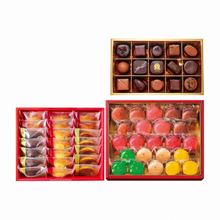 商品内容●セット内容:マカロン23個、コフレドショコラ15個、ドゥミセック(マドレーヌ・マドレーヌショコラ・アマンディーヌ各5、フィナンシェ×6)