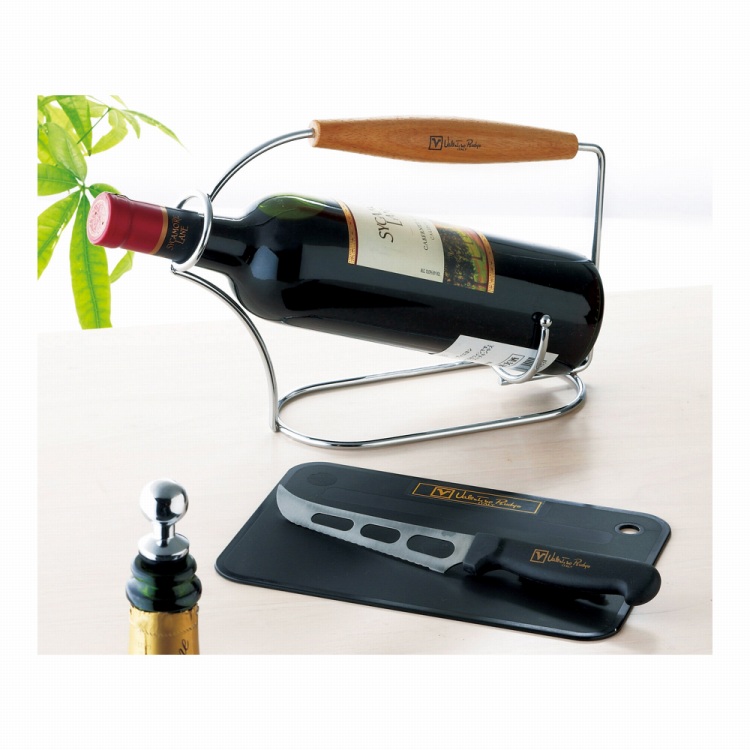 ●商品:ワインラック(約27×8.8×高さ18.5cm)・カッティングボード(約21.5×15×厚さ0.2cm)・チーズナイフ(刃渡約12.5cm・全長約23cm)・ボトルストッパー各1