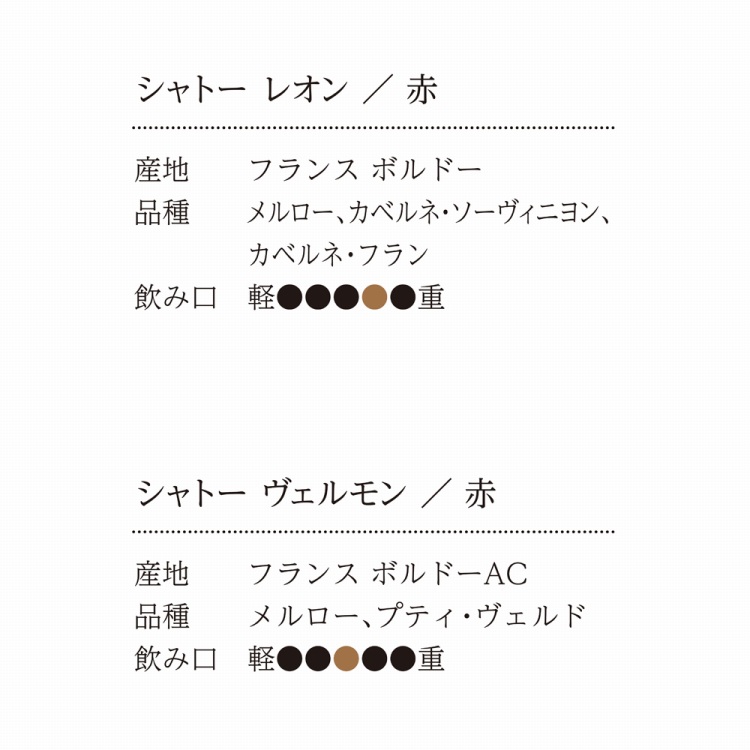 商品内容●シャトー レオン750ml×2、シャトー ヴェルモン750ml×2、ワインツールセット、ソムリエナイフ付