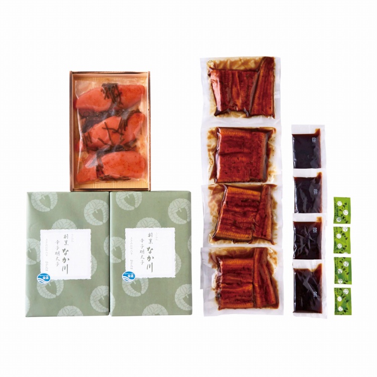 商品内容●セット内容:うなぎ蒲焼60g×4・柚子風味辛子明太子235g×3、タレ・山椒付