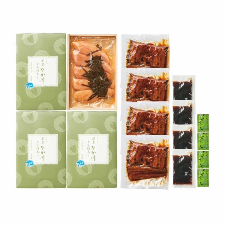 商品内容●セット内容:うなぎ蒲焼60g・柚子風味辛子明太子235g各4、タレ・山椒付