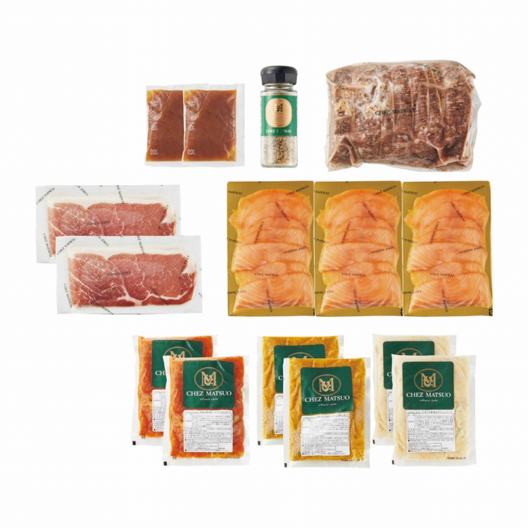 やわらかく仕上げた黒毛和牛のローストビーフと、まろやかな味わいのスモークサーモン、シェ松尾が選び抜いたプロシュート(生ハム)など、レストランの味をご家庭でもお気軽にお楽しみいただけるよう、シェ松尾監修のもと、丁寧な製法で作られたお料理をお届けします。