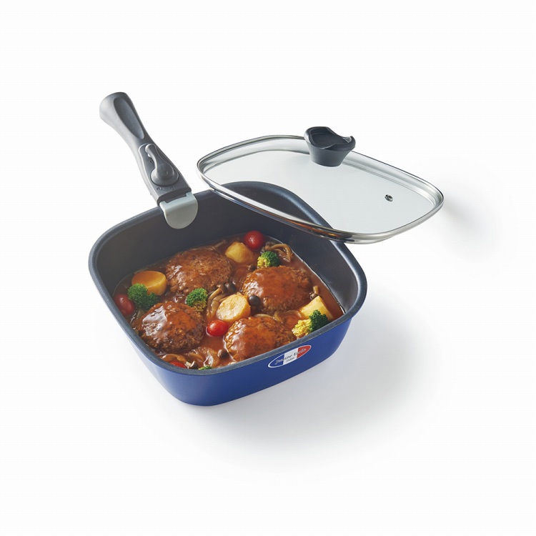 深いブルーのボディがキッチンに馴染むハンドル着脱式の鍋。