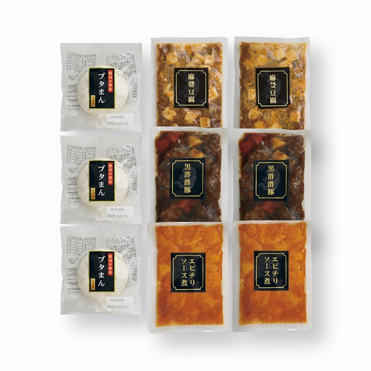 商品内容●セット内容:ブタまん120g×3、麻婆豆腐170g・黒酢酢豚170g・エビチリソース煮170g各2