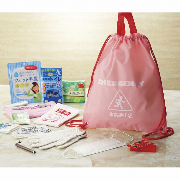 商品内容●商品:非常持出袋(約34×40cm)・FMラジオ(約11.2×3.5×高さ1.9cm)・ダイナモLEDライト(約5×2.8×長さ10cm)・静音アルミブランケット(約130×210cm)・IDホイッスル&カラビナリング・ペーパー歯みがき1日分・ウェットティッシュ・マスク・女性用軍手・生理用ナプキン(8枚入)・2WAYタッチペン・緊急避難カード・給水バッグ(約3L用)・ソーイングセット・レインコート・救急8点セット(絆創膏・ワンタッチ包帯・はさみ・毛抜き・爪切り・爪ヤスリ・救急手引)・エチケットケース・水に流せるペーパー・ウェット手袋・レジャーシート(約60×90cm)・フェイスタオル(約35×89cm)・ゴミ袋(3枚入)・救急てぬぐい・防災の心得・抗菌消臭簡易トイレ・トイレポンチョ・携帯用トイレ各1・使い捨てカイロ×2