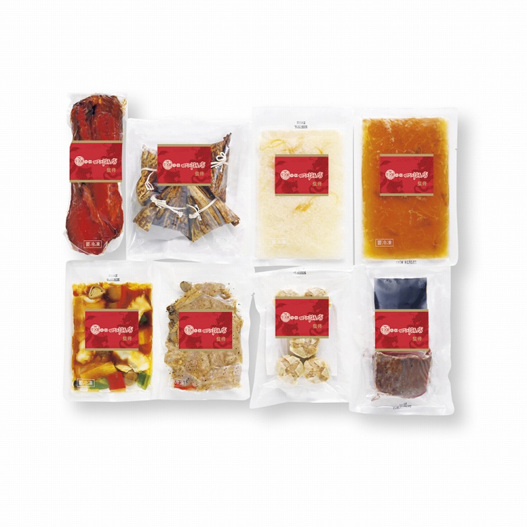 商品内容●セット内容:つるし焼豚430g・魚翅湯(フカヒレ入りスープ)250g・角煮入りちまき240g(4個入)・ふかひれ入粥200g・国産牛ローストビーフ(モモ)190g(ローストビーフ150g・特製ピリ辛ソース40g)・牛サーロインの黒胡椒炒め180g・エビとイカのピリ辛炒め150g・貝柱入焼売150g(5個入)各1
