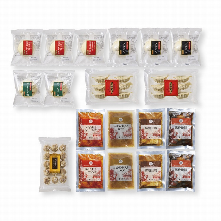 商品内容●セット内容:ブタまん120g・クルミ入り黒ゴマあんまん100g各3、チャーシュー包100g・エビチリソース煮170g・黒酢酢豚170g・麻婆豆腐170g・フカヒレ入りスープ150g・黒豚餃子(餃子6個入、タレ付)各2、エビ入りシウマイ(15個入)×1