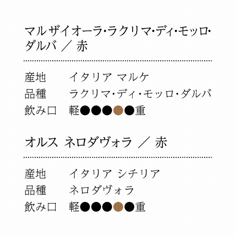 商品内容●マルザイオーラ・ラクリマ・ディ・モッロ・ダルバ750ml、オルス ネロダヴォラ750ml、ワインツールセット、ソムリエナイフ付