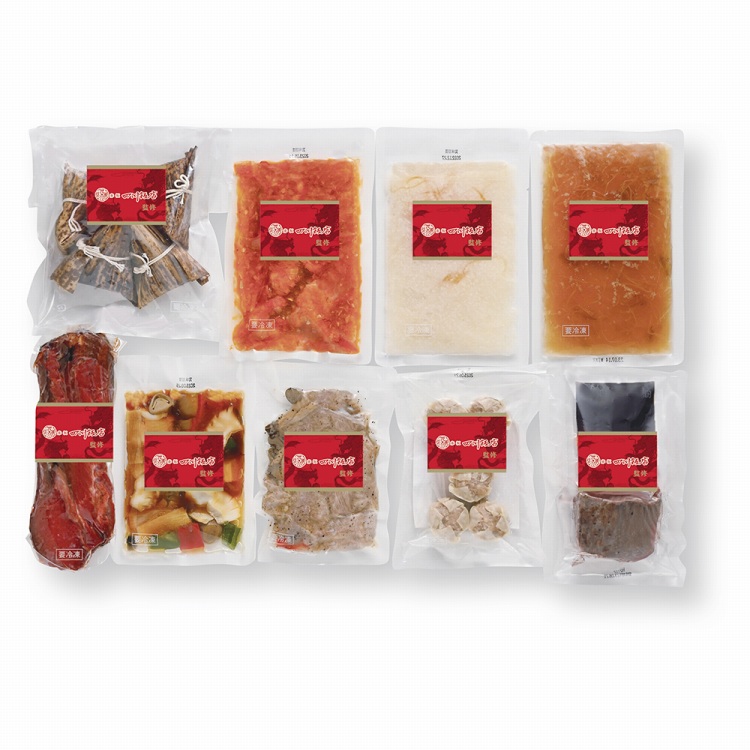商品内容●セット内容:乾焼明蝦(エビチリソース)250g・国産牛ローストビーフ(モモ/国内産)190g(ローストビーフ150g、特製ピリ辛ソース40g)・つるし焼豚430g・牛サーロインの黒胡椒炒め180g・魚翅湯(フカヒレ入りスープ)250g・角煮入りちまき240g(4個入)・ふかひれ入粥200g・エビとイカのピリ辛炒め150g・貝柱入焼売150g(5個入)各1