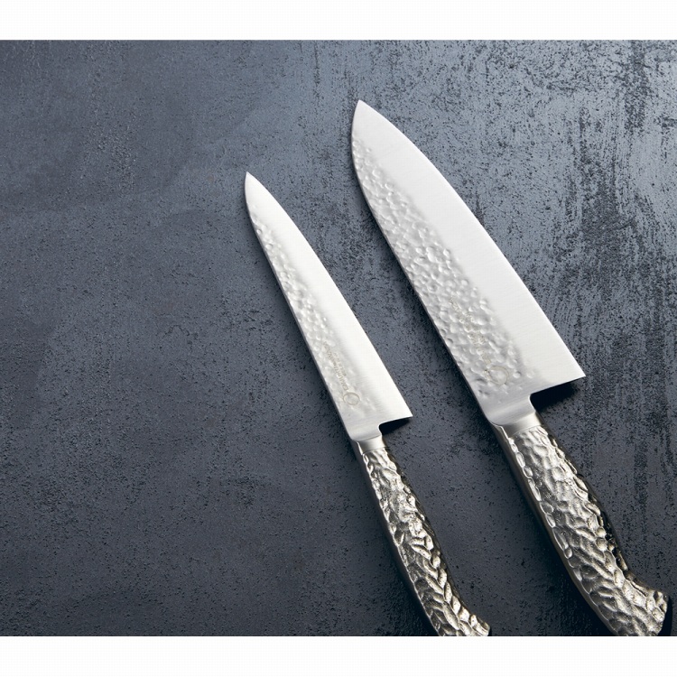 気品ある槌目模様のステンレス包丁は、食材の繊維を壊さず、うま味を逃さない切れ味が特徴です。
