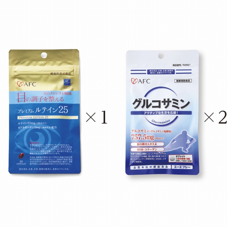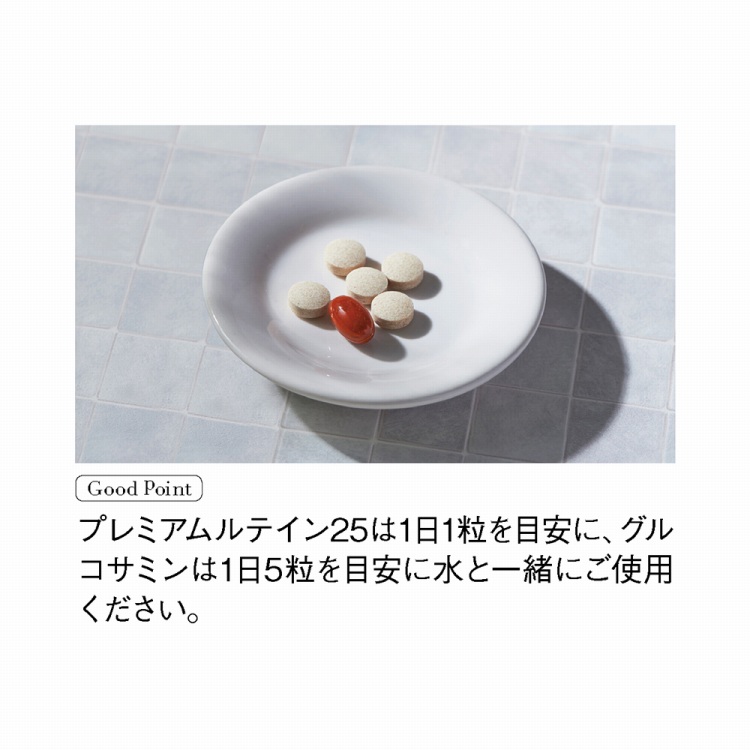 商品内容●セット内容:プレミアムルテイン25_13.65g(455mg×30粒)×1、グルコサミン_15g(300mg×50粒)×2
