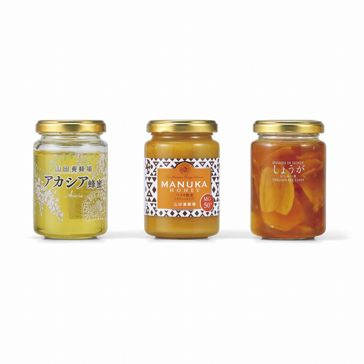 山田養蜂場で人気のアカシア蜂蜜としょうが蜂蜜漬、毎日の健康管理に役立つマヌカ蜂蜜のセット。