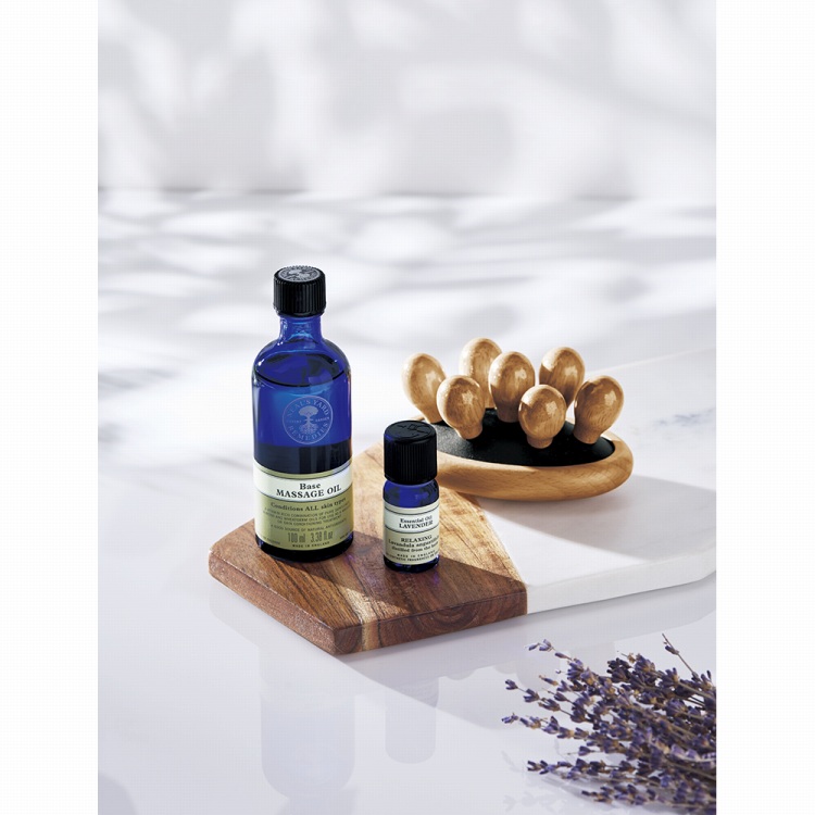手のひらサイズのビューティローラーに、3種の植物オイル※がブレンドされたベーシックなマッサージオイルと、華やかな香りのラベンダー精油のセット。