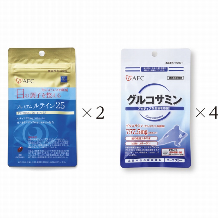 商品内容●セット内容:プレミアムルテイン25_13.65g(455mg×30粒)×2、グルコサミン_15g(300mg×50粒)×4