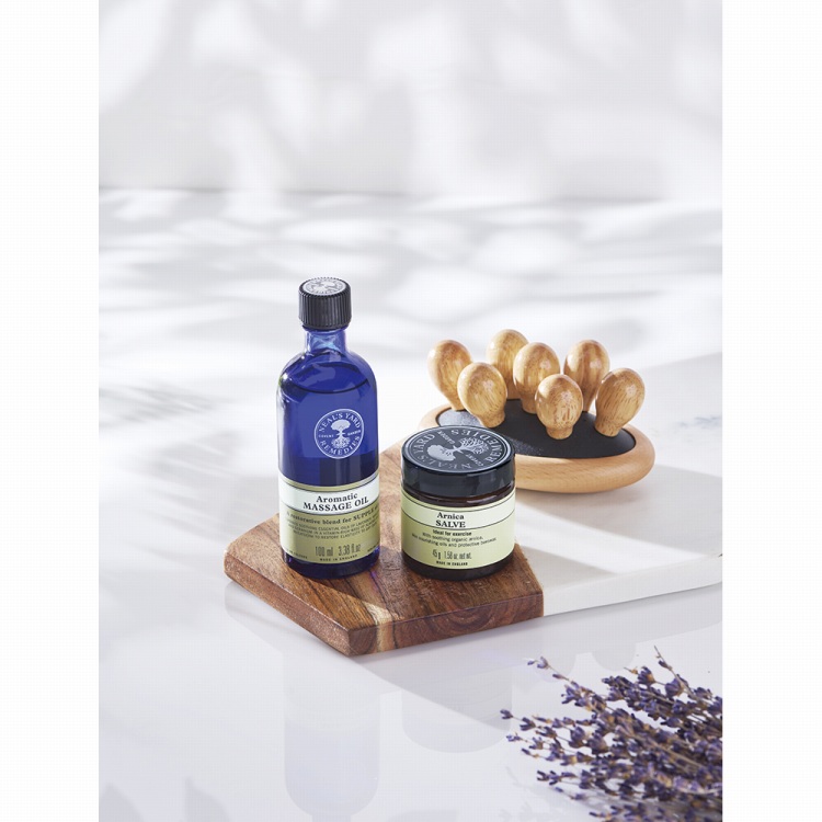リラックス感あふれるハーバルフローラル調の香りが特徴のボディオイルと、オフィスワークや立ち仕事などで頑張った肩や腰におすすめの固形マッサージバーム、手のひらサイズのマッサージローラーのセット。
