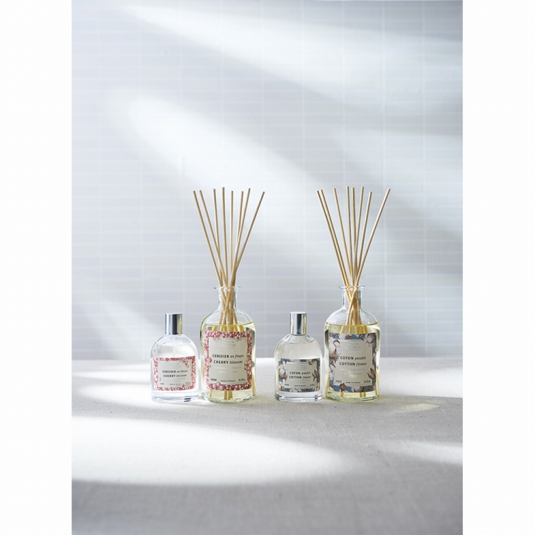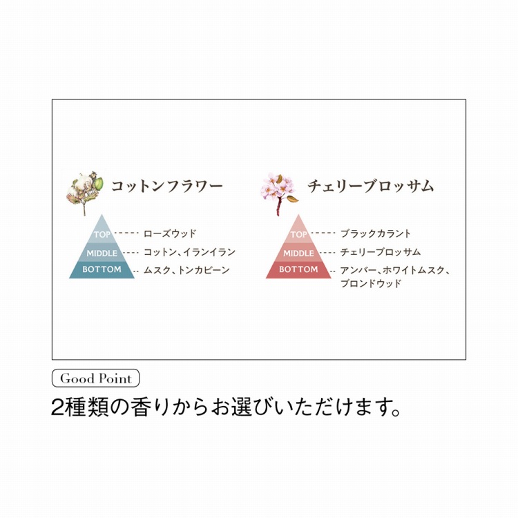 香りは、ぬくもりと安らぎが感じられるコットンフラワー、繊細で温かみのある桜を感じさせるチェリーブロッサムの2種類からお選びいただけます。