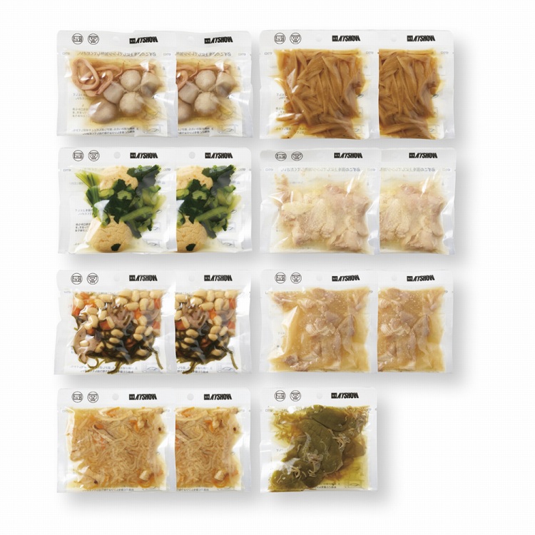 商品内容●セット内容:切干大根100g・ごぼう金平100g・いか小芋100g・鶏みぞれ煮100g・豚肉と大根の味噌煮100g・ひろうすと小松菜の煮物100g・大豆五目煮100g各2、じゃこ甘唐辛子100g×1