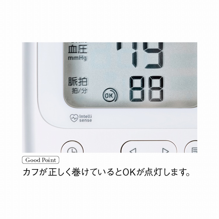 カフぴったり巻きチェックで、カフが正しく巻けているとOKが点灯します。