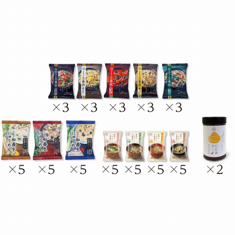 商品内容●セット内容:和養生にゅうめん(鶏とゆばの柚子塩・鴨南蛮・豆乳担々各5)、五養粥(黒・白・赤・黄・緑各3)、四季をいただくお味噌汁(葉もの野菜と白味噌・彩り野菜と花糀味噌・三種きのこと赤味噌・根もの野菜と田舎味噌各5)、しじみスープ170g×2