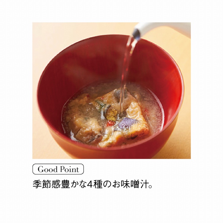 島原手延べそうめんを使用した「和養生にゅうめん」と、五行思想の五色に基づいた「五養粥」、魚介の旨味がつまったコンソメタイプの「しじみスープ」、「四季をいただくお味噌汁」をセットにしました。