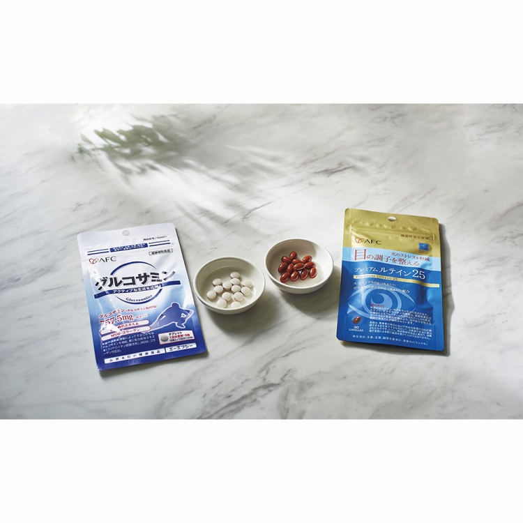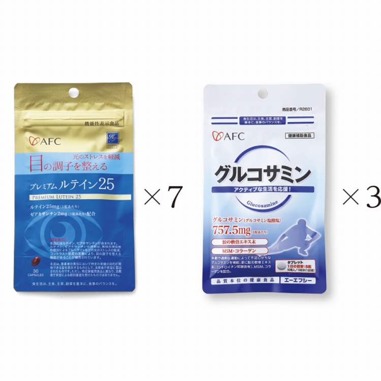 商品内容●セット内容:プレミアムルテイン25_13.65g(455mg×30粒)×7、グルコサミン_15g(300mg×50粒)×3
