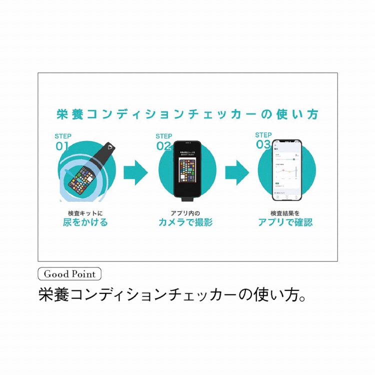 栄養コンディションチェッカーは、尿検査とAIの技術を組み合わせることで、カラダの栄養状態を可視化できる簡易迅速尿検査サービス。