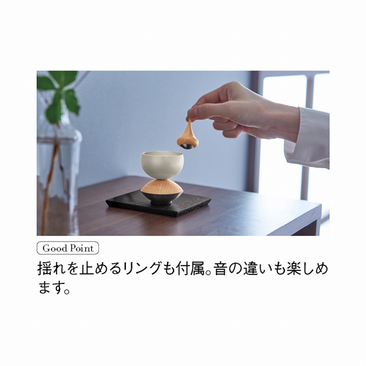 丸くデザインされた底で鳴らすたびにおりんとりん棒がゆらゆらと揺れ、ゆらぎのある音が空間を満たします。