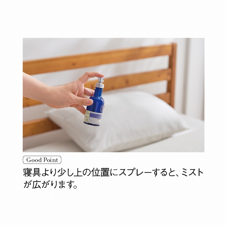 枕など寝具にひと吹きするピローミストはラベンダーやカモミールなどのほのかで優しいブレンド。