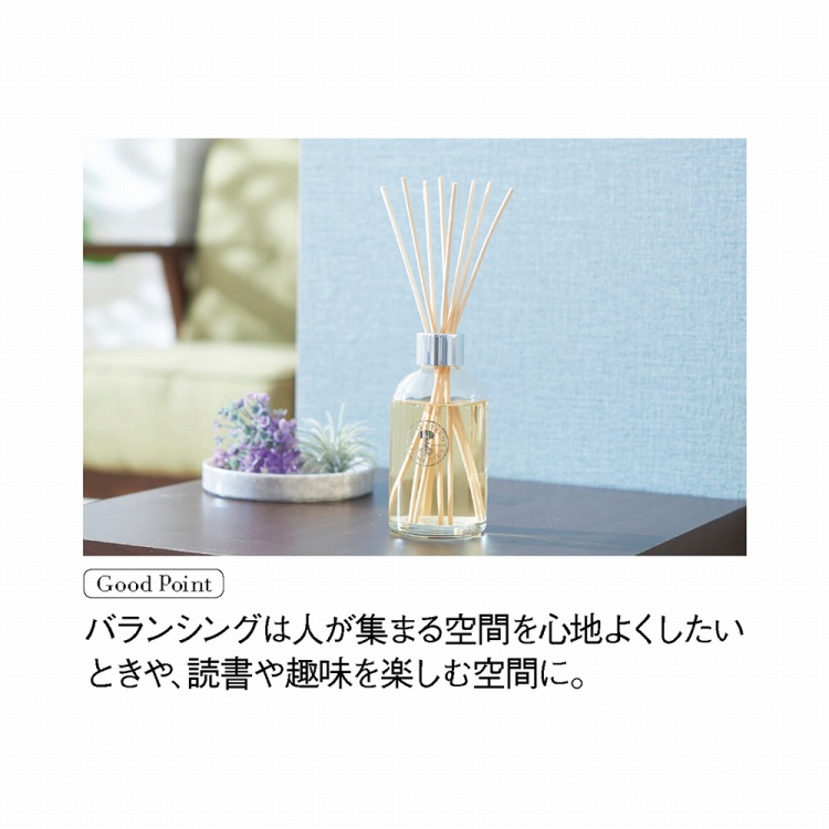 心地よい空間を作るディフューザーは、ハーブ・シトラス・ウッディのバランスがよい落ち着いた香りの「バランシング」と華やかなローズ香る「カーミング」。