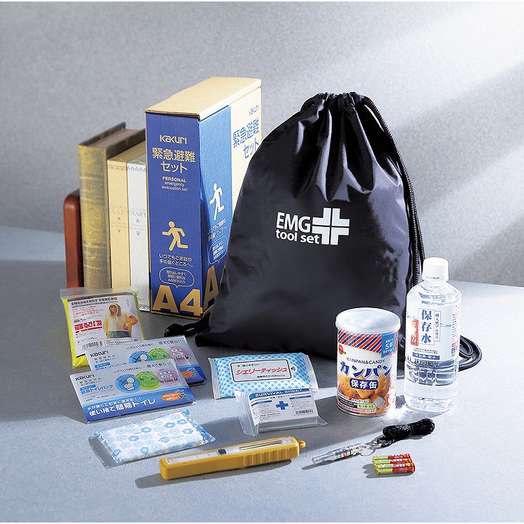 商品内容●商品:避難用ナップサック(約39×高さ45cm)・防寒保温シート(約213×132cm)・ポンチョ(約85×120cm)・スリムワークライト(約3×2.2×長さ17cm)・IDホイッスル・ウェットティッシュ・ポケットティッシュ・保存飲料水(500ml・国内産)・缶入カンパン100g各1・緊急トイレパック×2