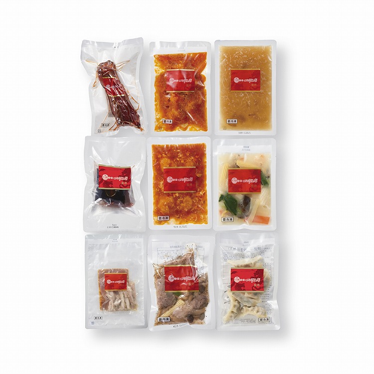 商品内容●セット内容:ローストビーフ(モモ/国内産)190g(ローストビーフ150g・特製ピリ辛ソース40g)・牛サーロイン黒胡椒炒め180g・大海老チリソース180g・魚翅湯(フカヒレ入りスープ)250g・海鮮八宝菜200g・棒々鶏セット150g(蒸し鶏110g・ソース40g)・乾焼明蝦(エビチリソース)250g・つるし焼豚430g・餃子120g(6個入)各1