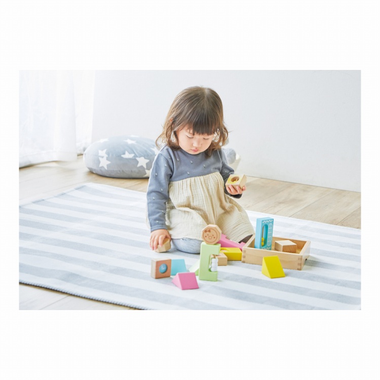 まずは積むあそびから始め、棒通しやひも通しをしたり、お人形あそびをしたり、サイコロを使った数の理解まで幅広くあそんで学べます。