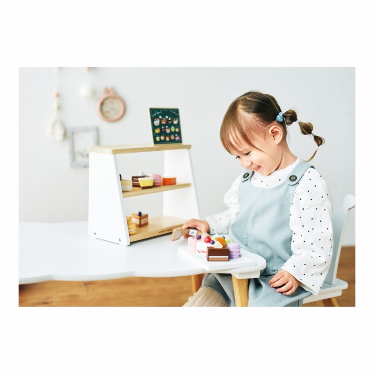 ショーケースやメニューボード、つかみやすいトングがついて本格的なお店屋さんごっこが楽しめます。