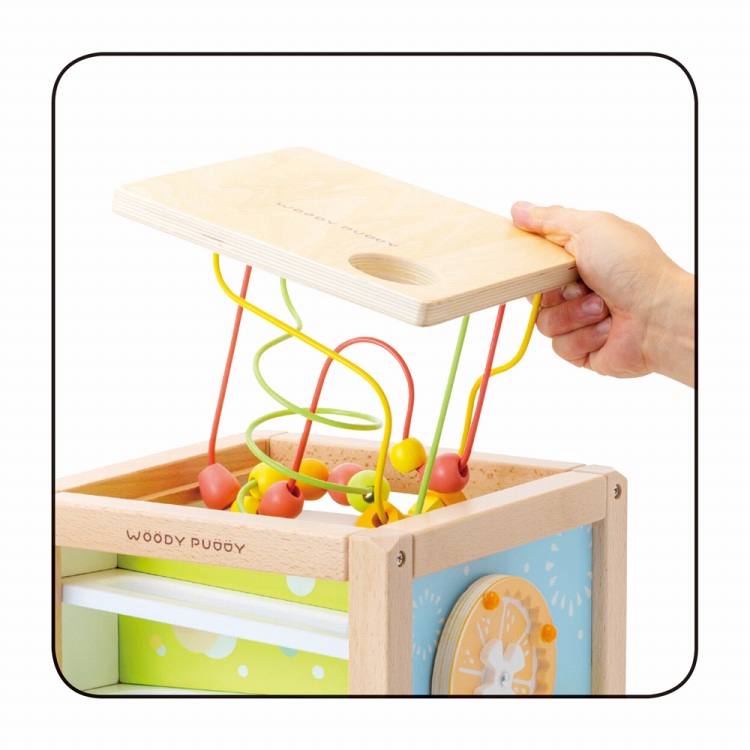 「ボール転がし」「ルーピング」「回転あそび」「色・数合わせ」「スライド」5つのあそびがつまった楽しい箱です。