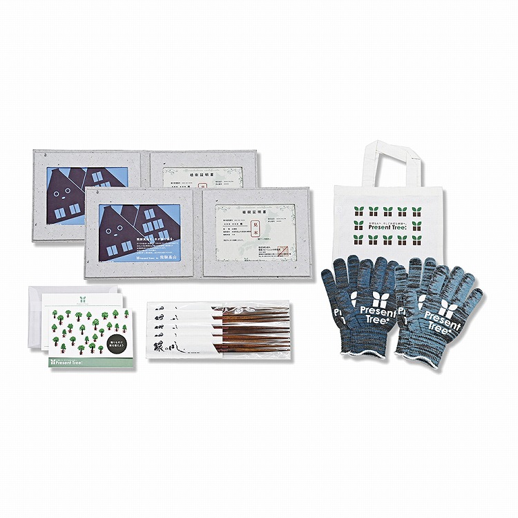 ●内容:植樹証明書(シリアルナンバー入り)・フォトフレーム・エコ軍手各2、メッセージカード・植栽地カード・リーフレット・封筒・エコバッグ各1、木製箸5膳