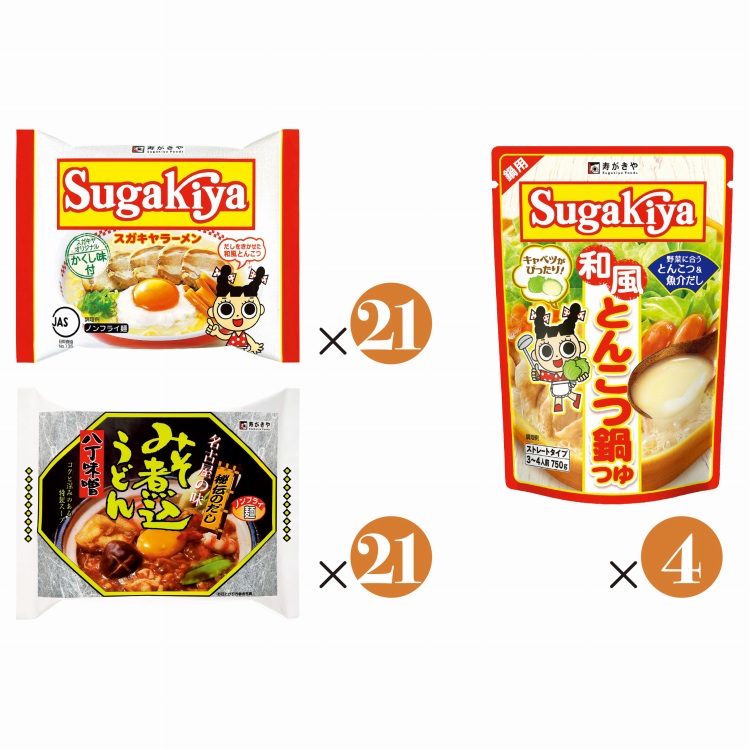 商品内容●セット内容:SUGAKIYAラーメン(乾麺80g×1、スープ付)・八丁味噌煮込うどん(乾麺80g×1、スープ付)各21、SUGAKIYA和風とんこつ鍋つゆ750g×4