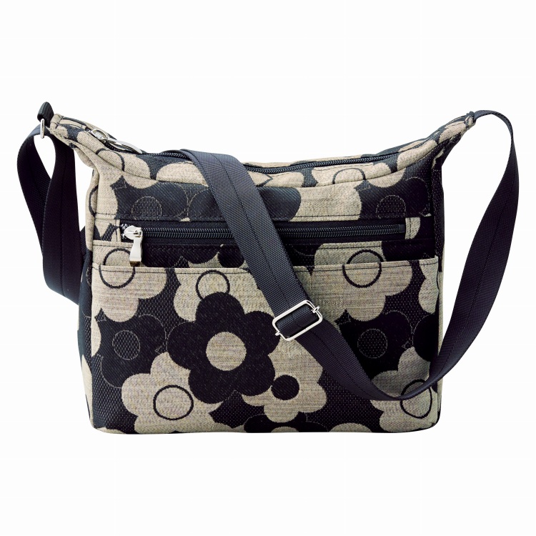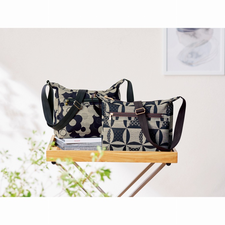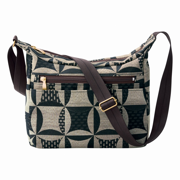 尾州織のジャカード生地に幾何学柄・花柄を織り込んだショルダーバッグは、大小6つのポケットがついて、お出かけに便利です。