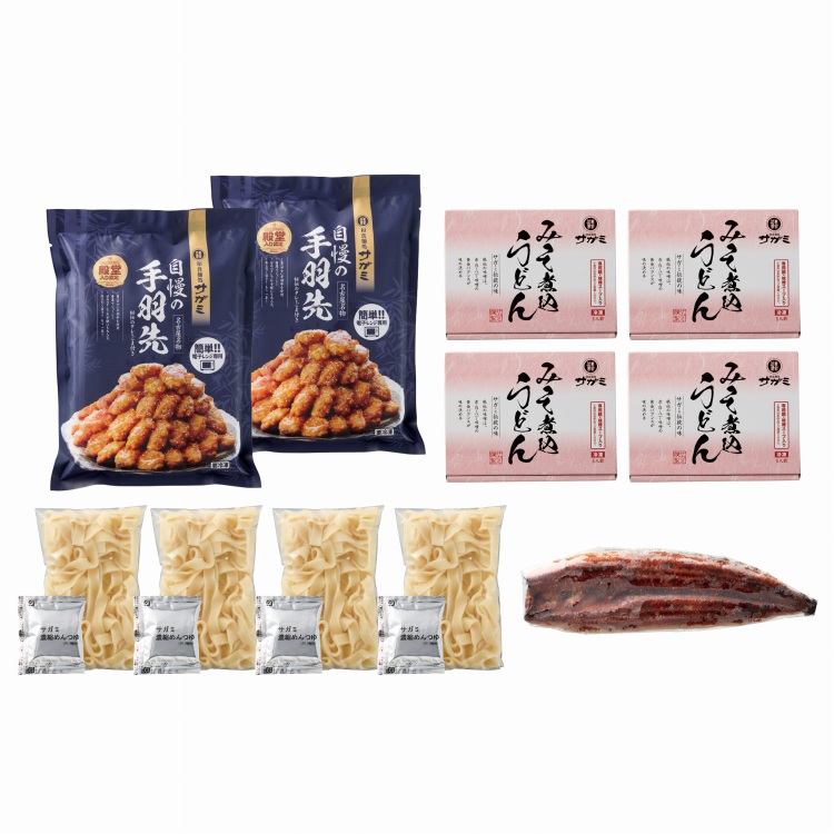 商品内容●セット内容:みそ煮込うどん(麺142g、濃縮みそスープ付)、きしめん(麺220g、濃縮めんつゆ付)各4、手羽先(10本入、たれ・ごま付)×2、うなぎ225g(たれ・山椒付)×1