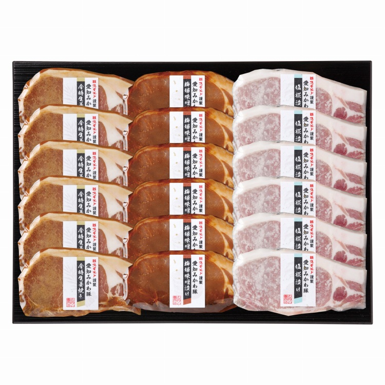 商品内容●セット内容:愛知みかわ豚ロース金時生姜焼65g(固形量55g)・愛知みかわ豚ロース桝塚味噌漬65g(固形量55g)・愛知みかわ豚ロース塩麹漬65g(固形量55g)各6