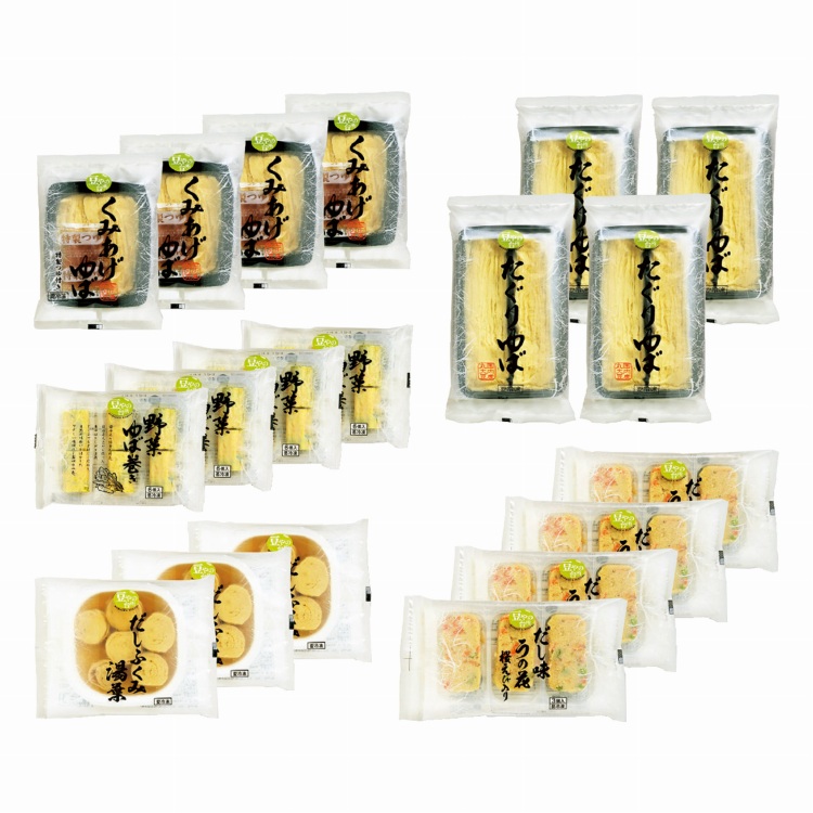 商品内容●セット内容:たぐりゆば70g・くみあげゆば90g(ゆば70g、つゆ20g)・野菜ゆば巻き102g・だし味うの花桜えび入り135g各4、だしふくみ湯葉130g×3