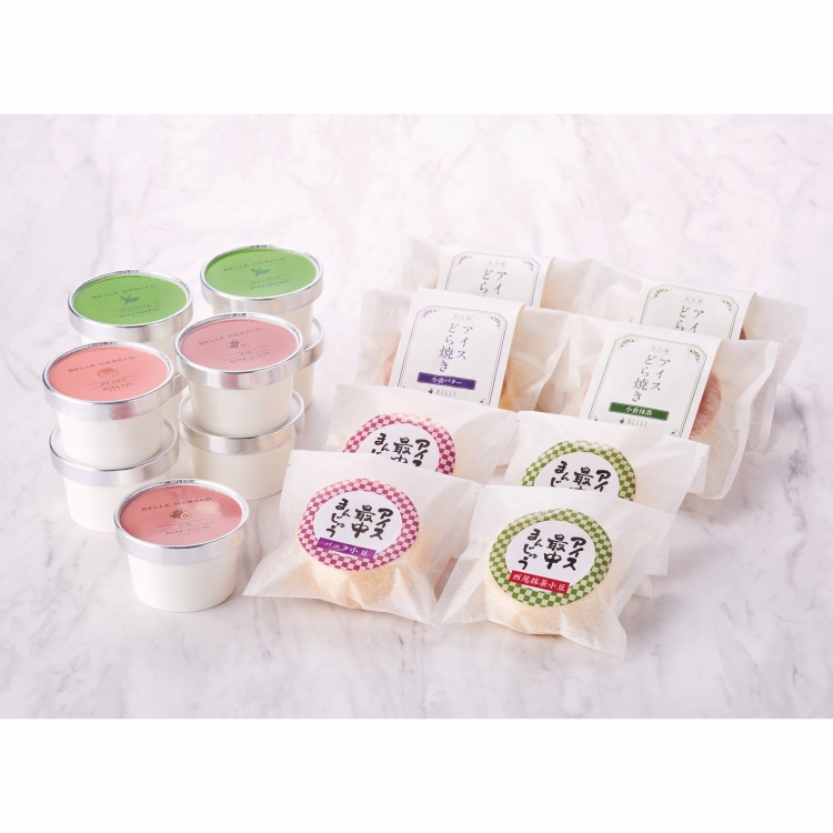 商品内容●セット内容:ジェラート(いちじく90ml・抹茶90ml・もも90ml各3)、アイスどら焼き(小倉バター・小倉抹茶各2)、アイス最中(バニラ・抹茶各2)